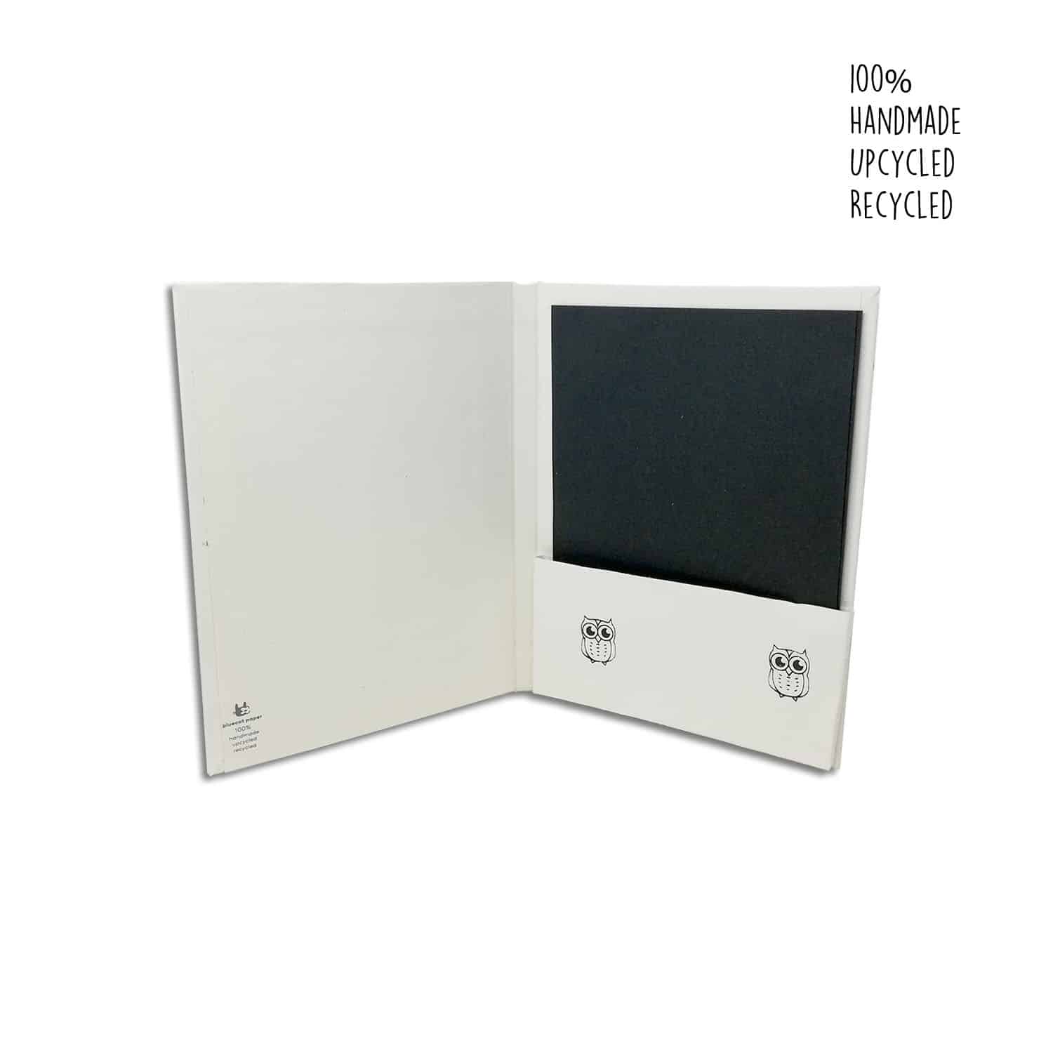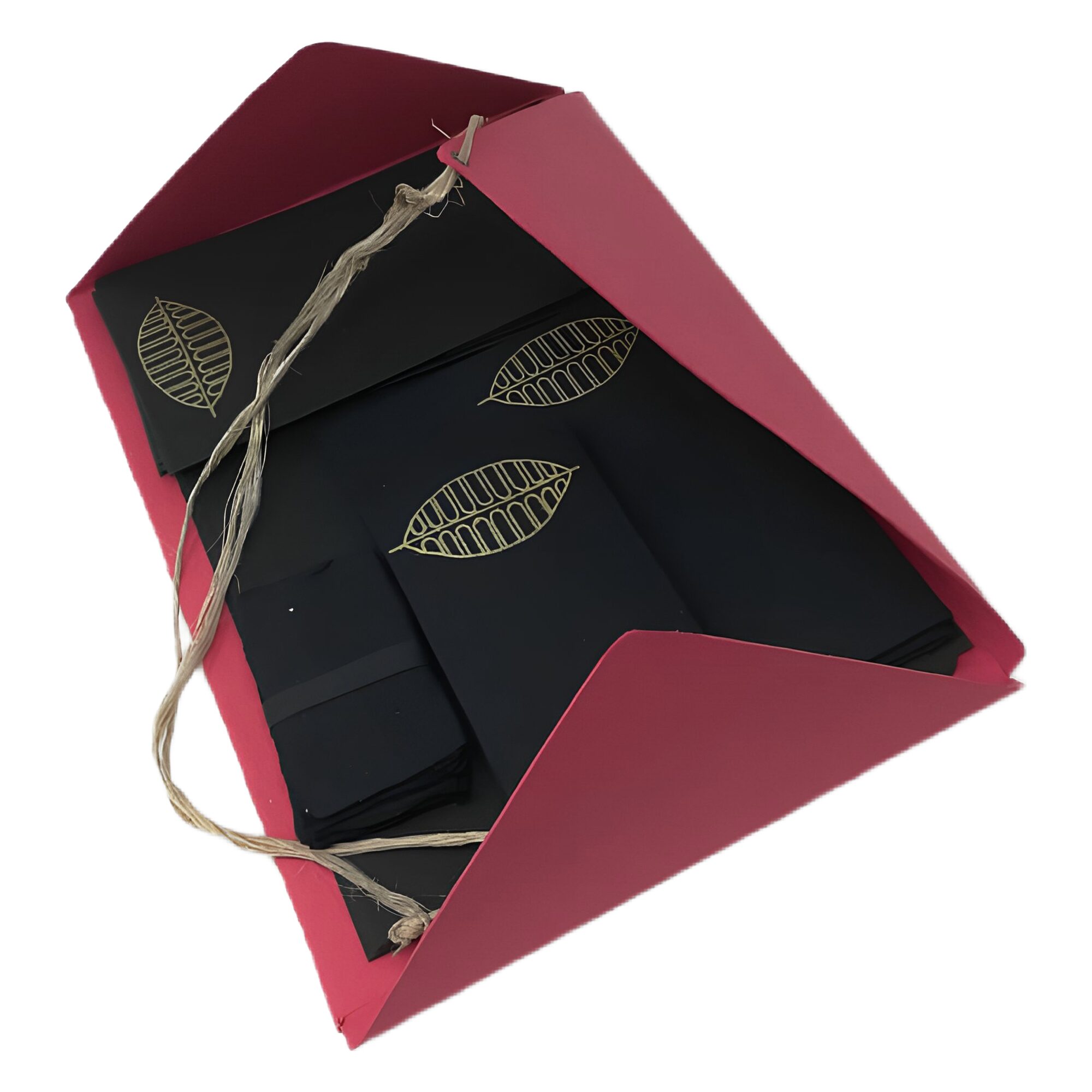 Our Beautiful handmade stationery file set, feature a simple, yet charming stationery set that is perfect for you. The set is handcrafted using paper made from cotton rags, so you can enjoy an up cycled and recycled stationery set. A minimally designed set that comes with a lovely off-white autumn leaf print. As each visiting card, envelope, greeting card, thank you card, and letterhead is crafted using a traditional hand pressed method.