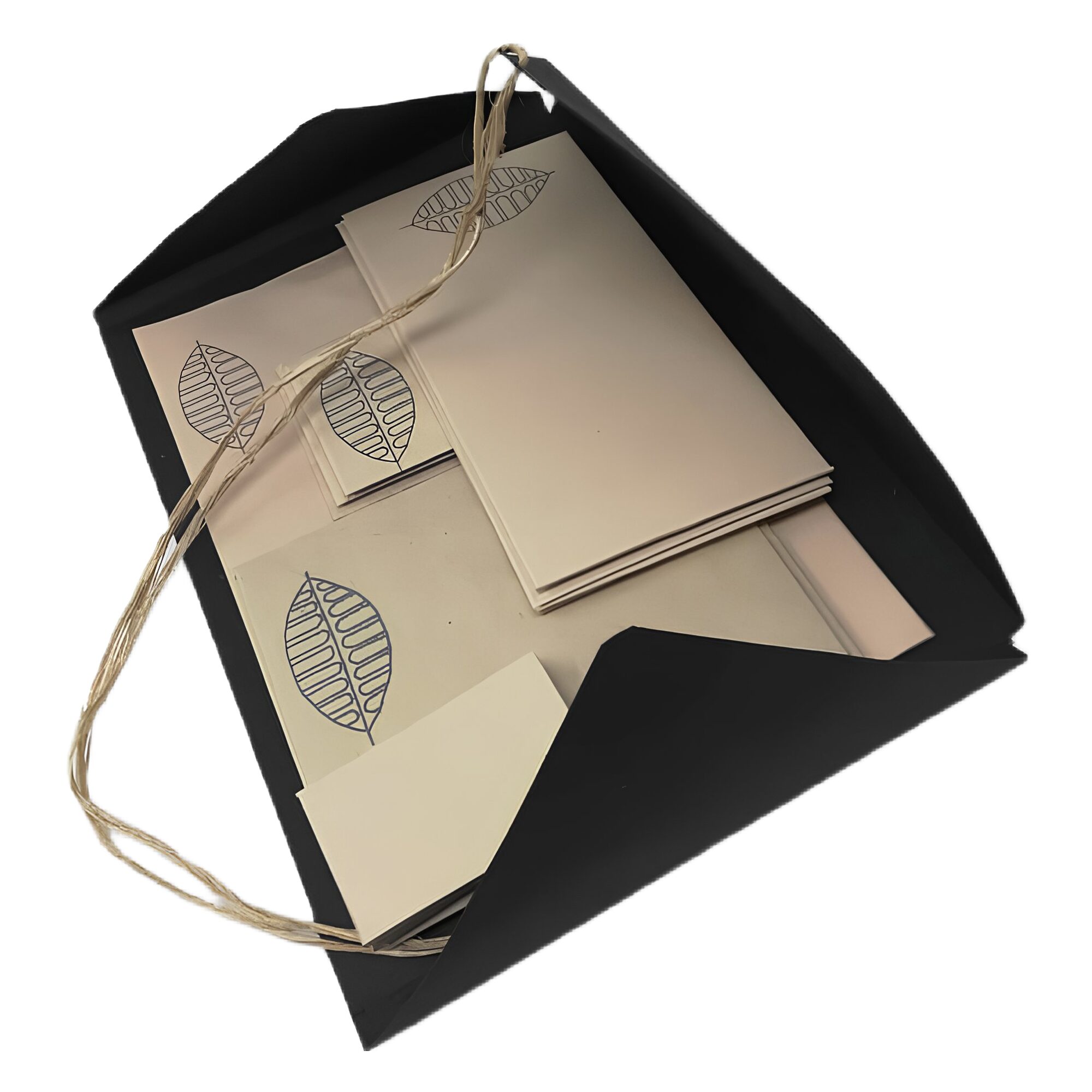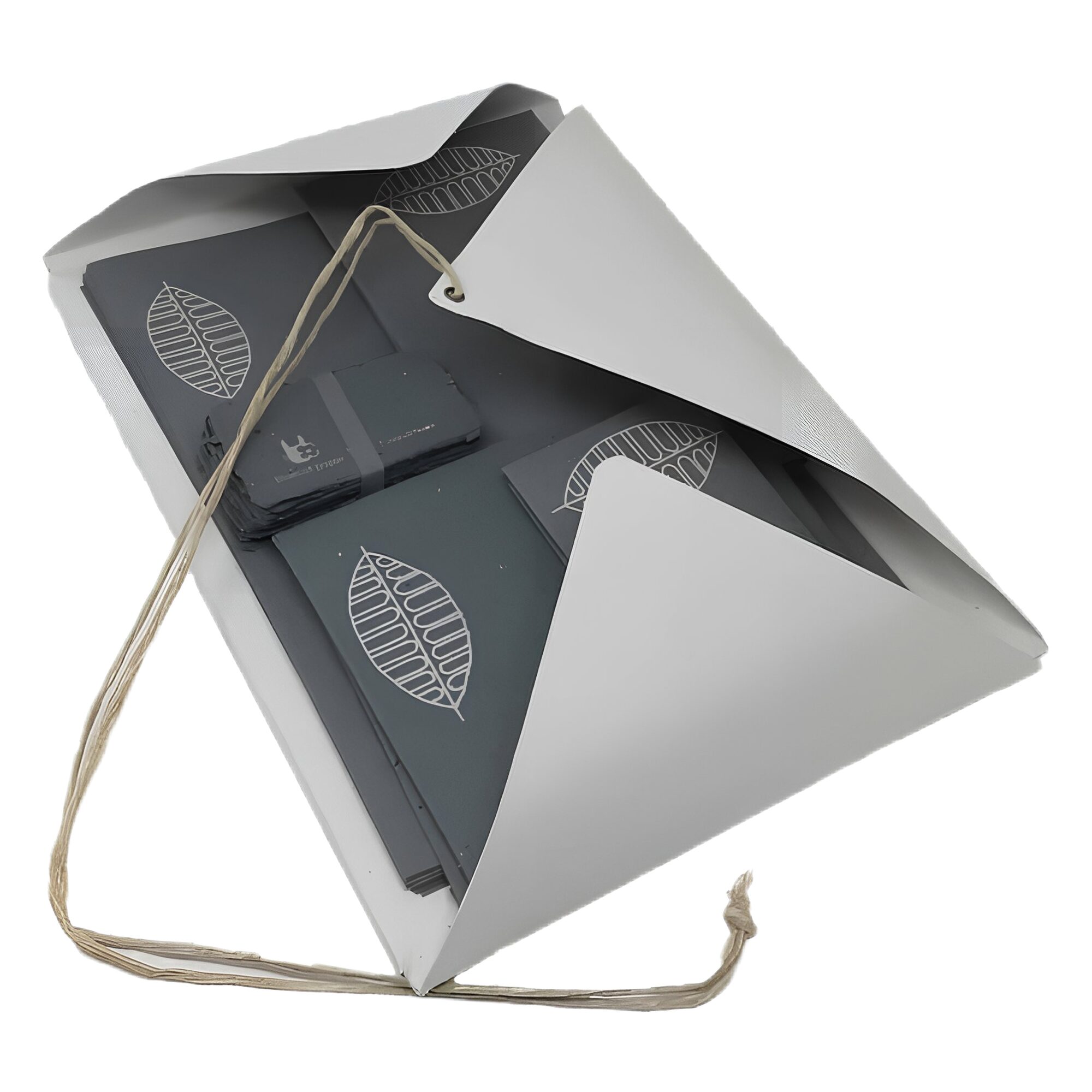 Our handmade stationery set, and file feature a simple, yet Charming handmade stationery set that is perfect for you. The set is handcrafted using paper made from cotton rags, so you can enjoy an up cycled and recycled stationery set. A minimally designed set that comes with a lovely grey autumn leaf print. As each visiting card, envelope, greeting card, thank you card, and letterhead is crafted using a traditional hand pressed method.