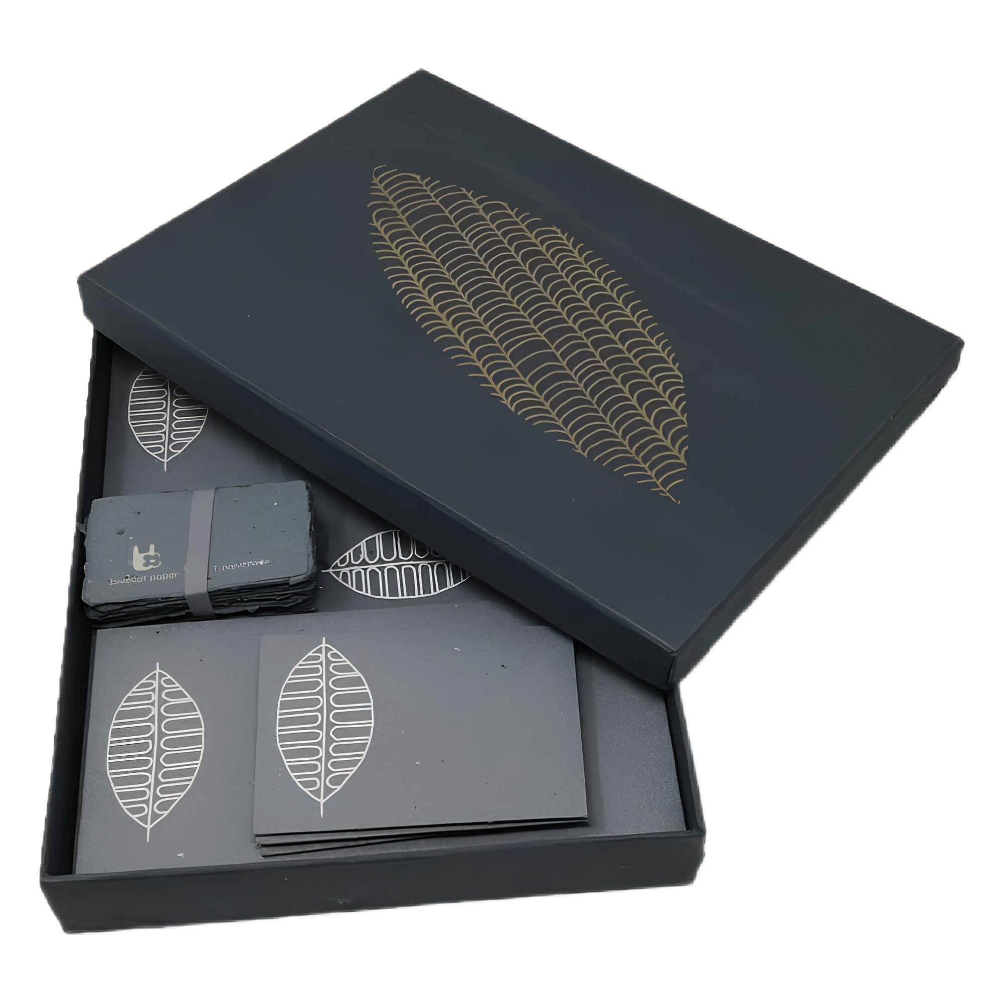 our beautiful handmade stationery box, and box feature a simple, yet charming stationery set that is perfect for you. The set is handcrafted using paper made from cotton rags, so you can enjoy an up cycled and recycled stationery set. A minimally designed set that comes with a lovely grey autumn leaf print. As each visiting card, envelope, greeting card, thank you card, and letterhead is crafted using a traditional hand pressed method.